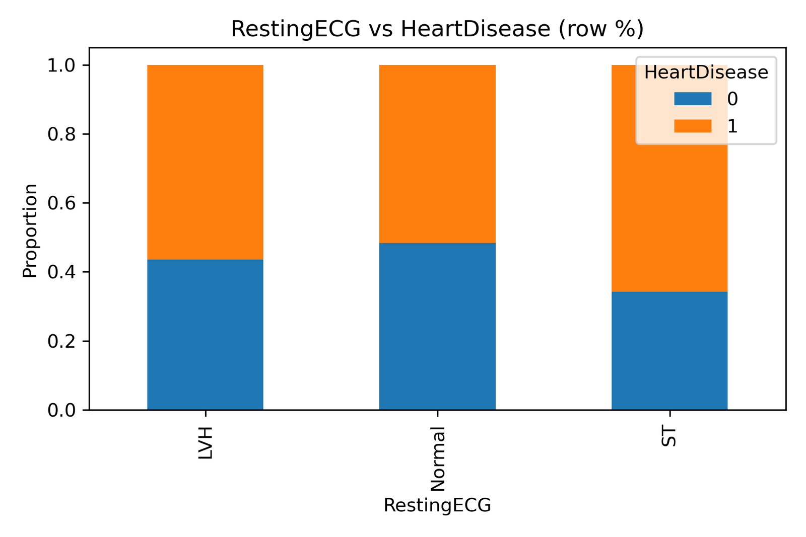 The chart titled “RestingECG vs HeartDisease (row %)” represents proportions of individuals with and without heart disease across three ECG categories: